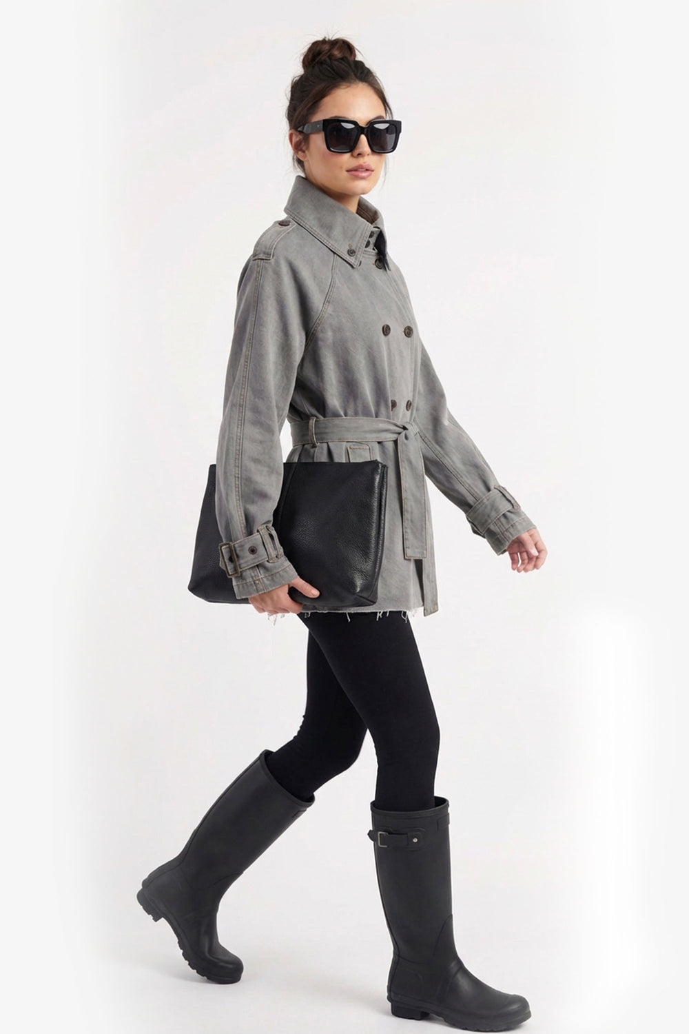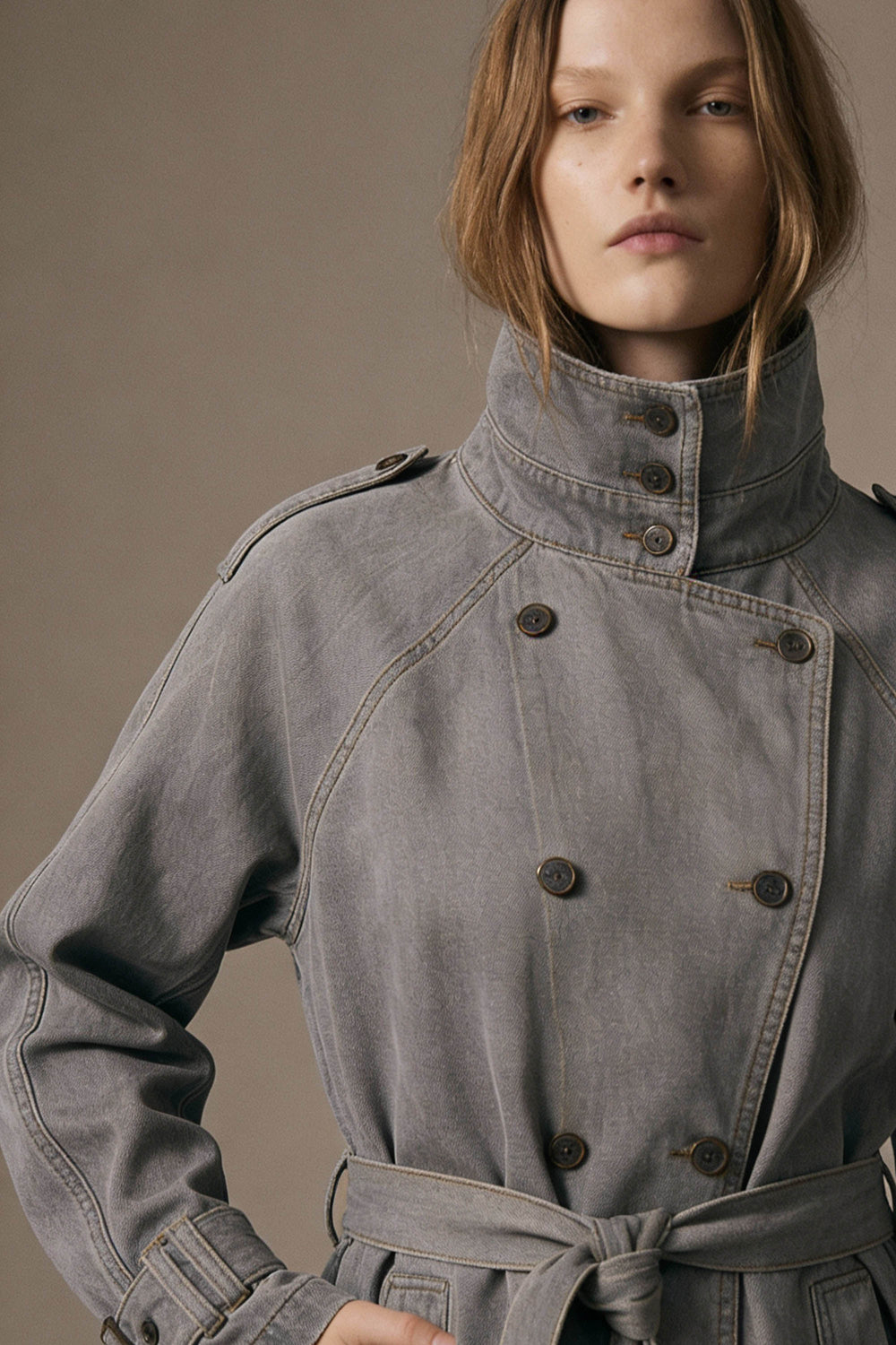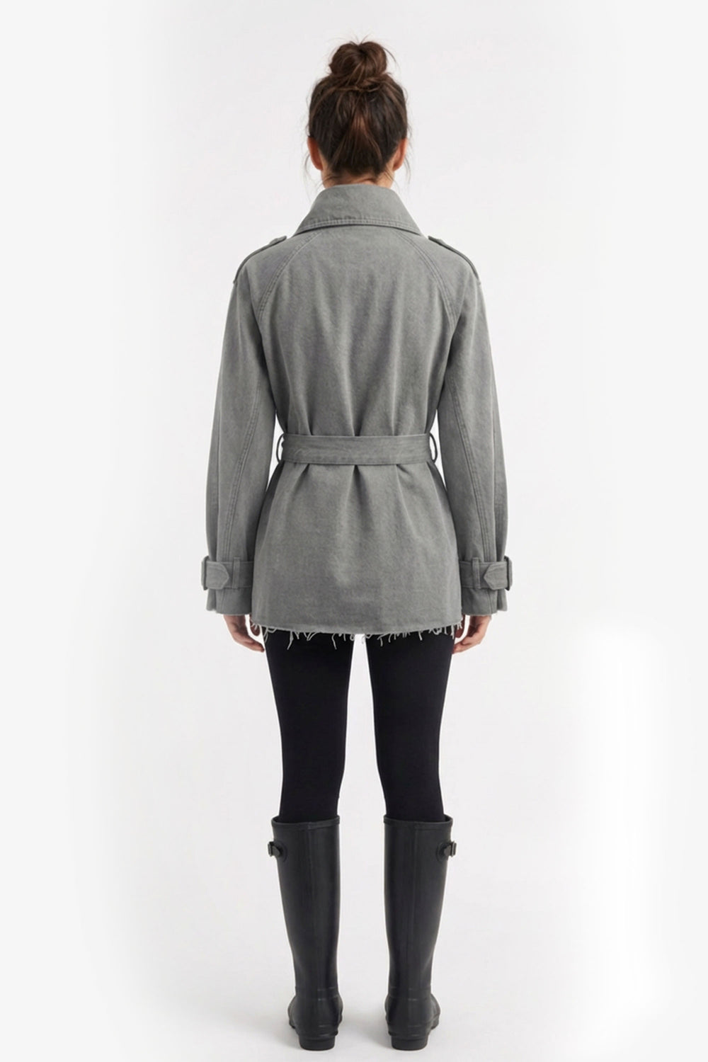 Denim Belted Short Trench Jacket - Gray