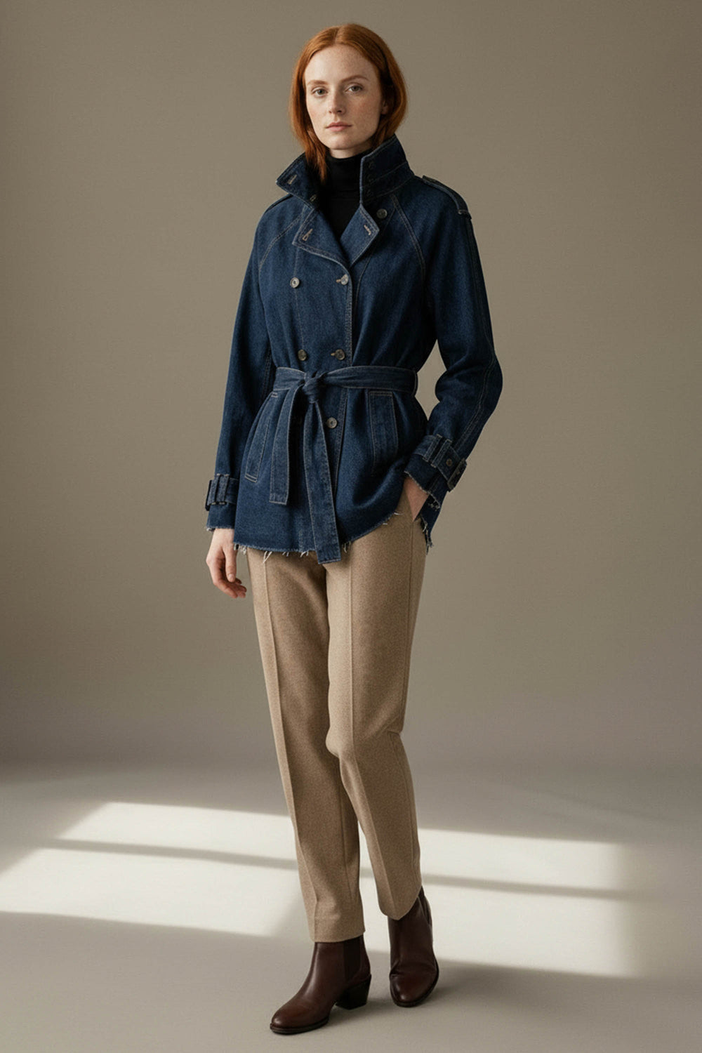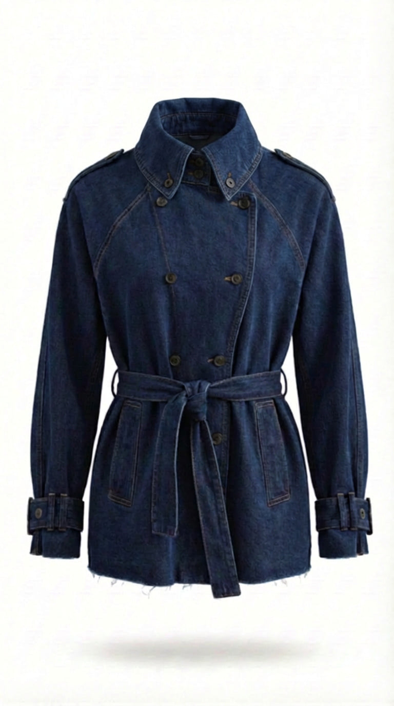xA refined interpretation of the trench silhouette, reimagined as a short denim trench jacket. Designed with a belted waist, structured collar, and buckle cuff details, it offers both edge and elegance. The refined wash highlights the quality and character of the premium denim. Cut in a versatile length, it layers seamlessly over dresses, skirts, or tailored trousers. A designer denim jacket for women, balancing functionality with statement design.
