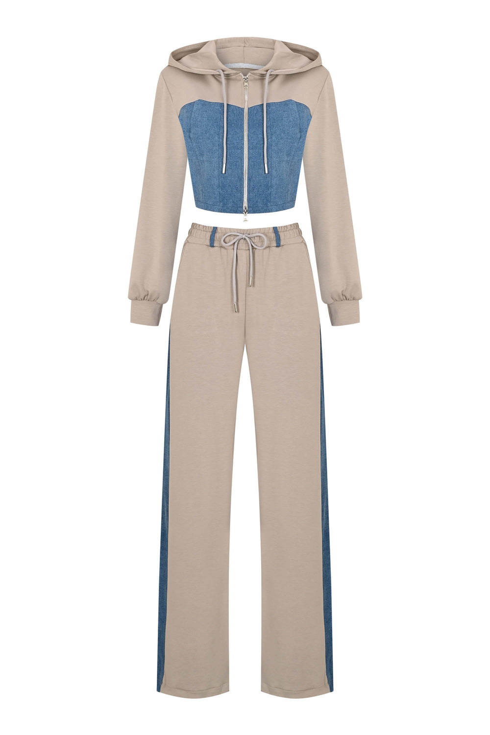 Denim Detail Cotton Tracksuit Set with Two-Way Zipper – Light Beige