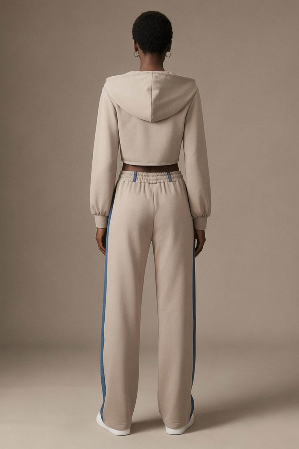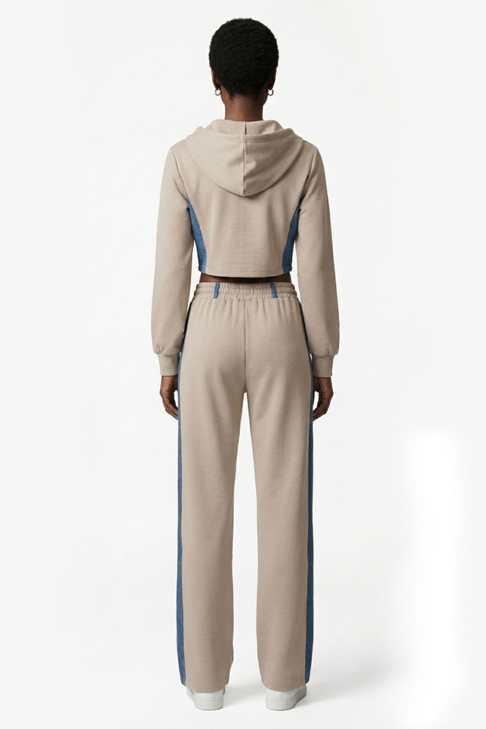 xA statement in modern loungewear. This designer, co-ord tracksuit set combines soft-touch 100% cotton fabric with denim panels across the chest and sides for a structured contrast. The cropped hoodie features a two-way zipper, allowing versatile styling and layering, while the wide-leg drawstring pants ensure comfort and ease of movement. The refined finish highlights the quality of both the cotton and denim detailing, creating an elevated aesthetic. A premium tracksuit set for women, perfect for streetwear, travel, or elevated athleisure.