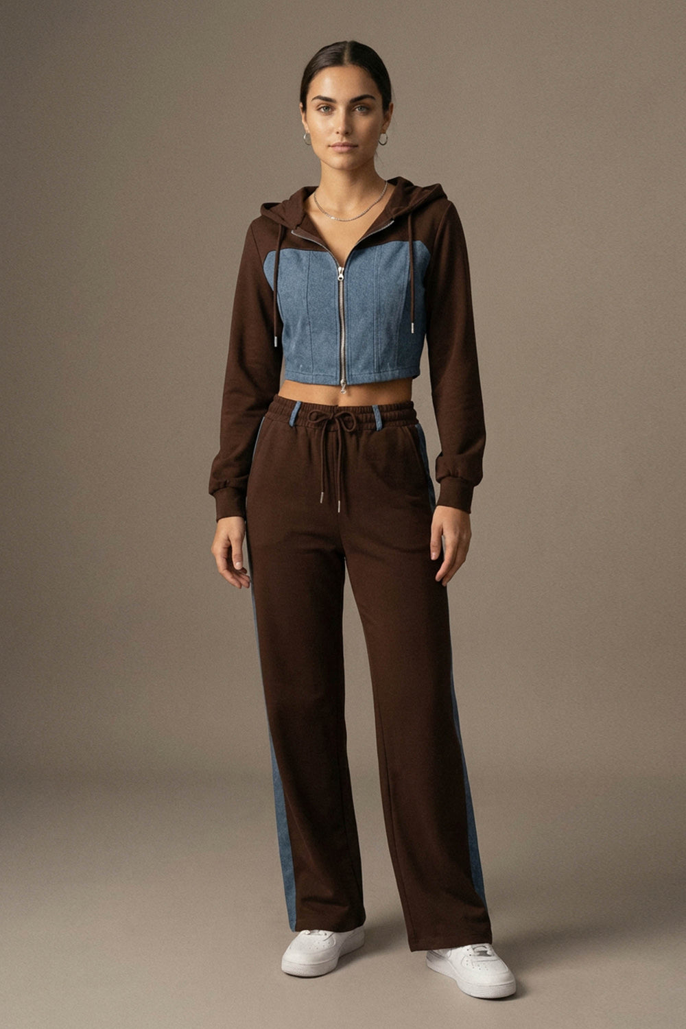 xA statement in modern loungewear. This designer, co-ord tracksuit set combines soft-touch 100% cotton fabric with denim panels across the chest and sides for a structured contrast. The cropped hoodie features a two-way zipper, allowing versatile styling and layering, while the wide-leg drawstring pants ensure comfort and ease of movement. The refined finish highlights the quality of both the cotton and denim detailing, creating an elevated aesthetic. A premium tracksuit set for women, perfect for streetwear, travel, or elevated athleisure.