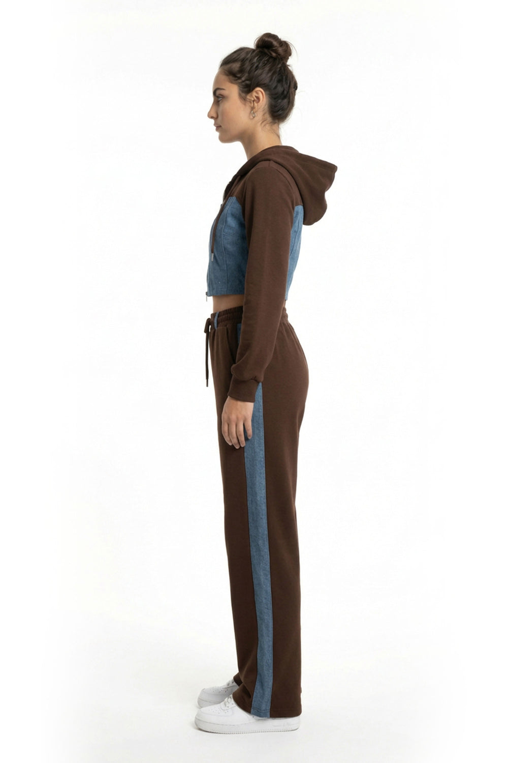 Denim Detail Cotton Tracksuit Set with Two-Way Zipper – Brown