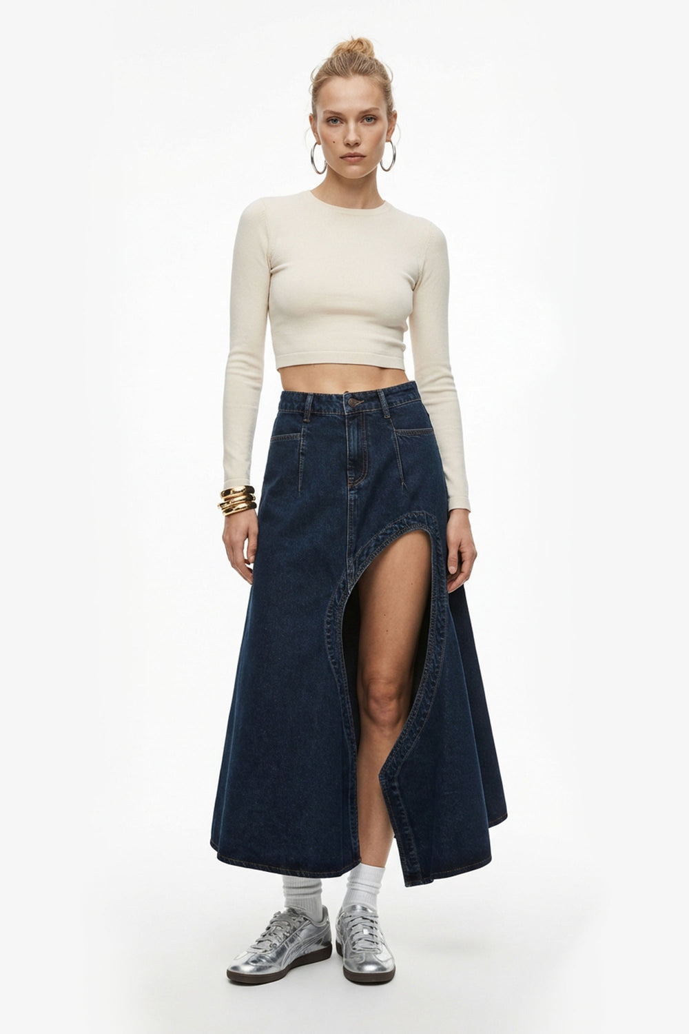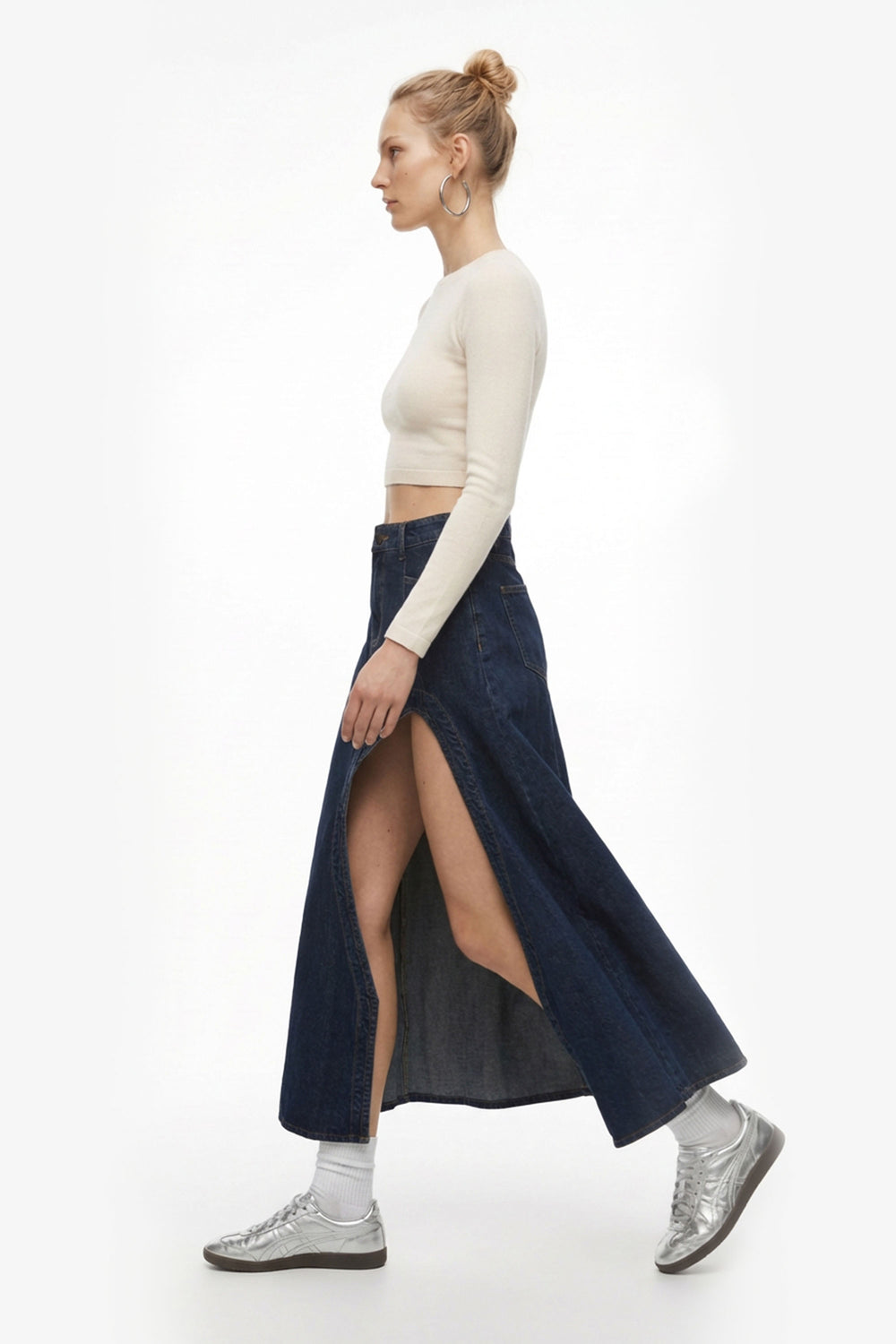 xCrafted from premium washed denim, this denim maxi skirt with high slit redefines a classic silhouette with a modern edge. The long denim skirt features a structured waistband with belt loops, authentic five-pocket construction, and a dramatic front slit for fluid movement and visual impact. Cut from premium cotton denim with a refined finish, it balances structure with ease of wear. A versatile statement piece that pairs effortlessly with heels for evening, boots for city wear, or sneakers for casual styling, transitioning seamlessly from day to night for casual chic, street style, or dressed-up occasions.
