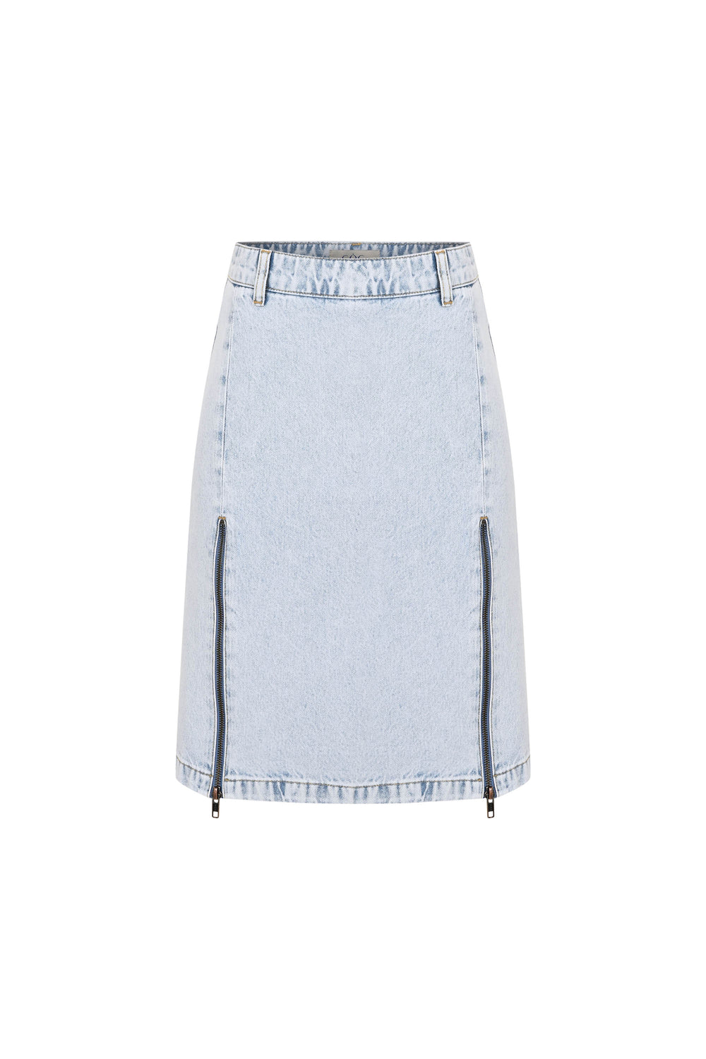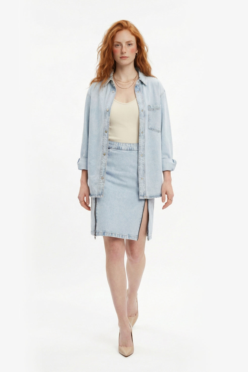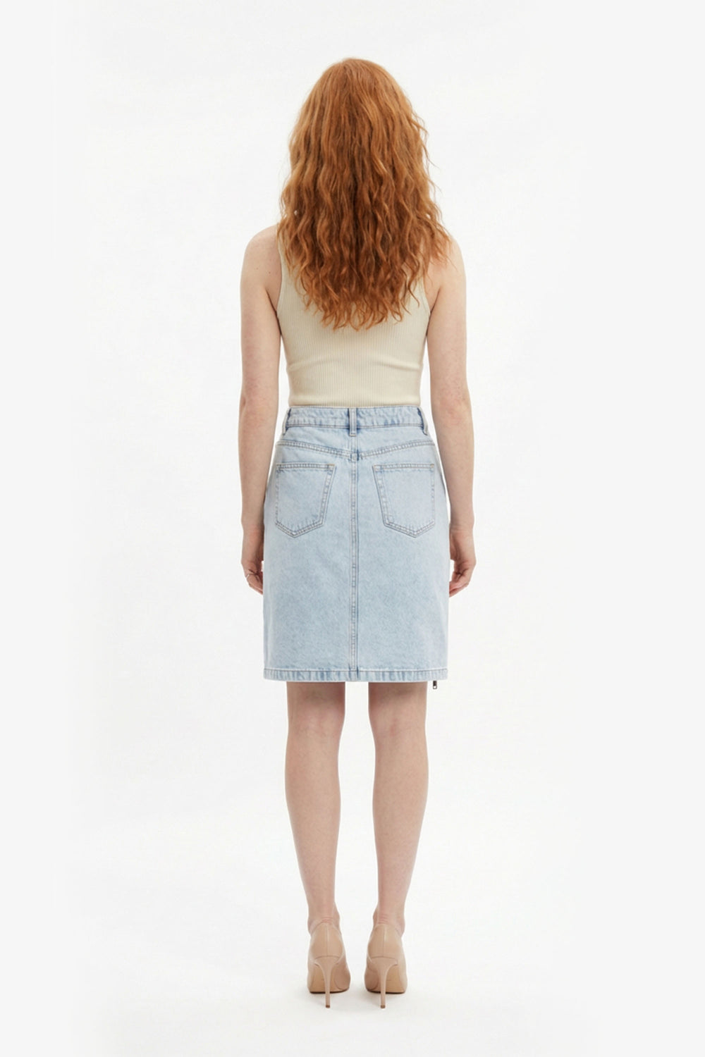 xA refined take on a classic pencil skirt, this denim pencil skirt is tailored in a slim fit with a front slit for ease of movement and subtle edge. Cut from premium denim, it features a mid-rise waist, belt loops, and clean finishes for versatile styling. The refined wash highlights the quality and character of the fabric, creating a polished yet approachable aesthetic. A designer denim skirt for women that pairs effortlessly with blouses, shirts, or outerwear — equally suited for daywear or elevated evening style.