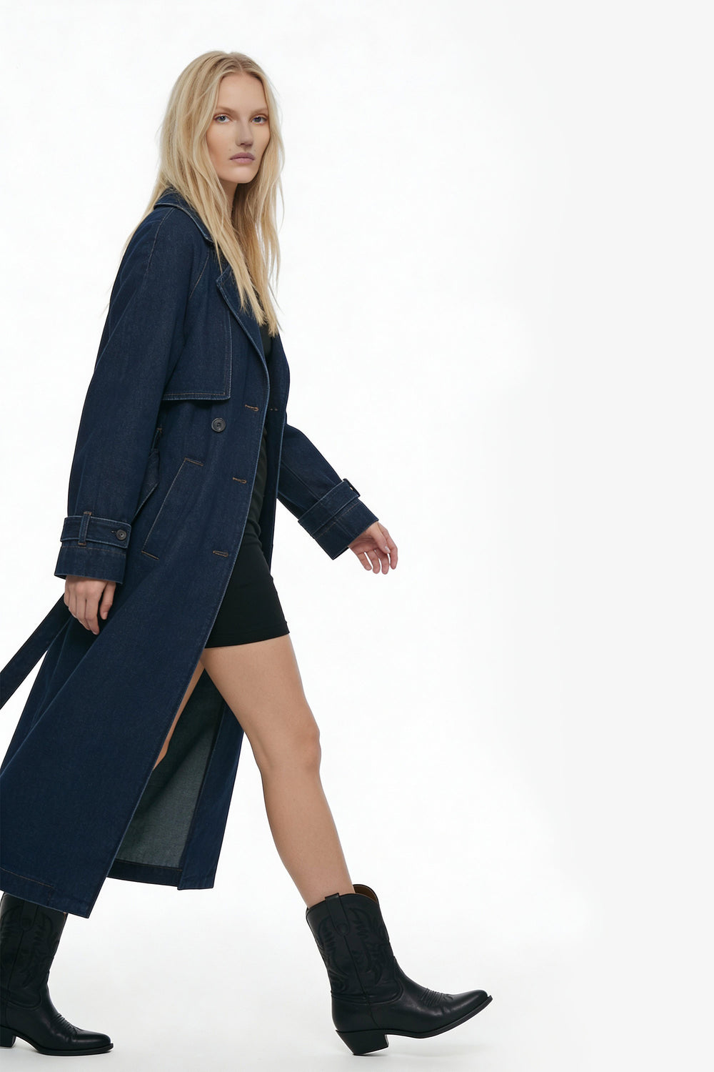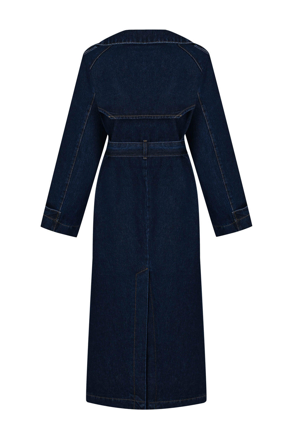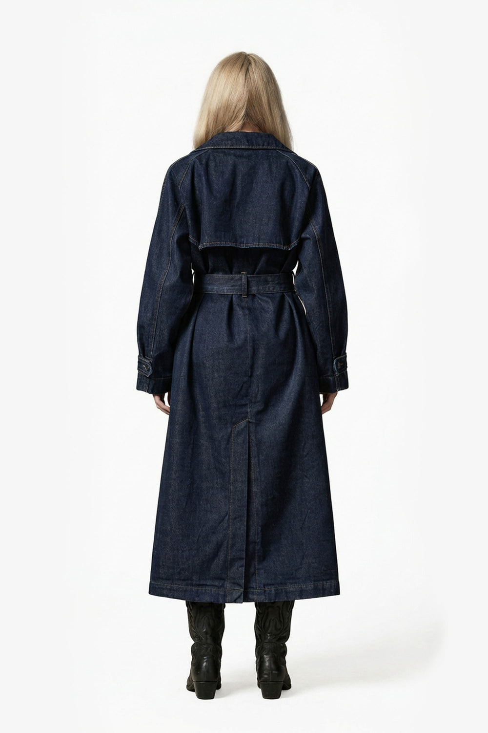 xA modern interpretation of the classic trench coat, reimagined in premium denim. This oversized denim trench coat is tailored with strong padded shoulders, a belted waist, and premium lining for structure and comfort. The refined finish highlights the quality and depth of the fabric, offering a versatile outerwear piece that layers effortlessly over knits, trousers, or dresses. Finished with classic button closures, a belted tie, and functional pockets, it blends casual sophistication with high-end tailoring. A designer denim trench coat for women that brings understated elegance to Fall/Winter wardrobes.